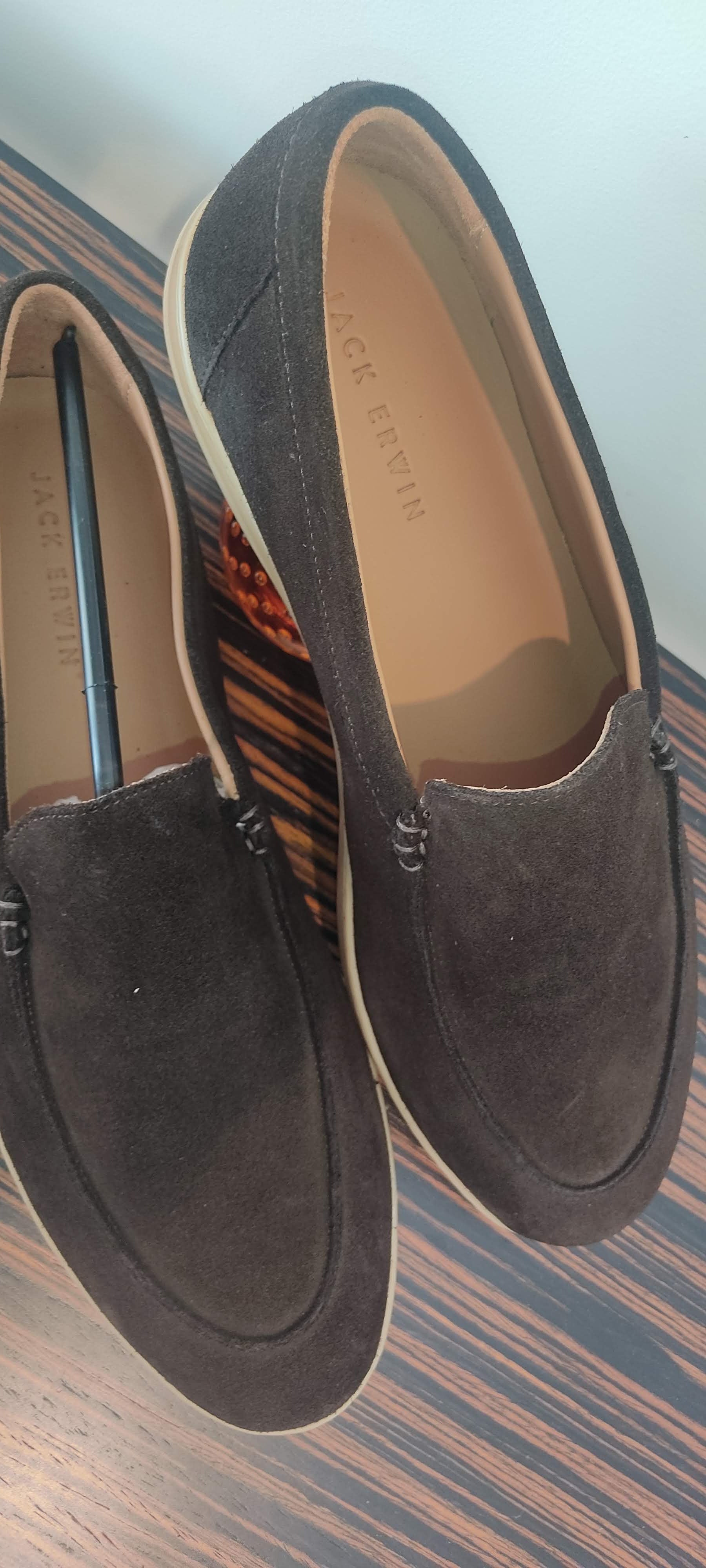 Elegant Tanner loafers by Jack Erwin, all in dark brown and coffee suede. Made with the highest quality materials. Fully leather-lined with a padded foam insole and flexible rubber outsole. Handmade in Portugal. Jack Erwin was founded in 2013 in New York City by Lane Gerson and Ariel Nelson. Jack Erwin shoes are defined by functional elegance. Each pair combines minimal aesthetics, thoughtful details, and quality construction. New, without the brand box. #luxury #designer #genuineleather #leather #chic #fashion #elegant #brandElegantes loafers Tanner, da Jack Erwin, todo em camurça castanho escuro, café. Com materiais de altíssima qualidade. Totalmente forrado em pele com palmilha de espuma acolchoada, sola de borracha flexível. Feito à mão em Portugal. A Jack Erwin foi fundada em 2013 na cidade de Nova Iorque por Lane Gerson e Ariel Nelson. Os sapatos Jack Erwin definem-se pela elegância funcional. Cada par combina estética mínima, detalhes cuidados e construção de qualidade. Novos, sem a caixa da marca #luxo #designer #courogenuíno #pele #chic #moda #elegante #marca